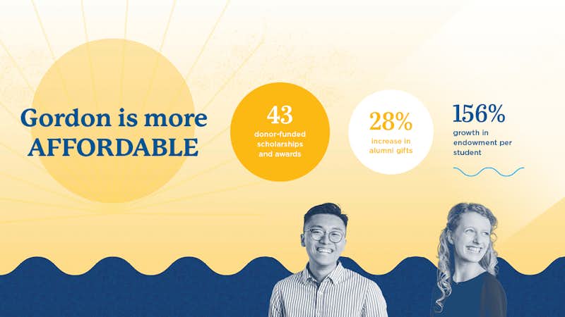 Gordon has been fortunate to be named in Washington Monthly’s “Best Bang for the Buck”; Money’s “The Best Colleges in America, Ranked by Value”; LendEDU’s “Best Colleges for Financial Aid”; and “Inexpensive Colleges and Universities” in Fiske Guide to Colleges. But accolades alone weren’t enough to close the ever-widening gap between household income and college costs. More had to be done. Born from a desire both to recruit and retain top Christian students and to graduate them without significant educational debt, affordability became a key driver for Faith Rising. Through the campaign, Gordon has dramatically decreased tuition costs to families and increased the volume of merit- and need-based scholarships for students.