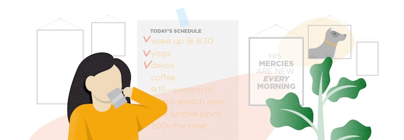 One of the best ways to overcome cabin fever and establish a sense of normalcy in a period of unexpected changes, is to stick to a schedule. Every day doesn’t have to look the same, but it’s helpful to have rituals in place that help you transition from play mode to work mode and back again. It may be helpful for you to commit to regular study blocks and schedule your breaks. Before jumping into school work, it may be helpful to make yourself a cup of coffee, read through a morning devotional or go through some yoga exercises. If you’re missing your college friends, make a plan to eat lunch together or play Settlers of Catan (among others) online over Skype on a set day every week. If you already had a planned weekly Bible study or book group, keep that going through video as well.