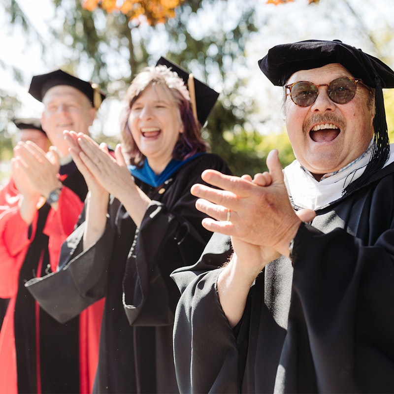 Chair of the Board of Trustees Dr. Carrie Tibbles ’93 presented four individuals with honorary degrees in recognition of their exceptional work and service. Dale E. Fowler received a Doctorate of Business and his wife, Sarah Ann Fowler, a Doctorate of Public Service to commend their work as philanthropists and avid supporters of Christian higher education. Pastor Roberto Miranda was posthumously awarded a Doctorate of Divinity in recognition of his legacy of substantial contributions to the Church and to Gordon. His wife, Mercedes “Meche” Lopez-Miranda, received a Doctorate of Divinity for her contributions as a spiritual and community leader.