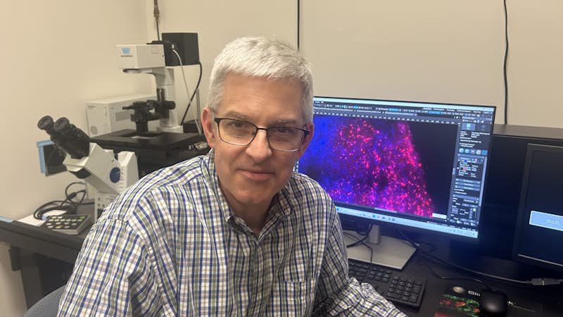 Pictured above: Dr. Craig Story with a standard fluorescence microscope to the left and an image of a stained mouse tumor slice on the computer to the right.