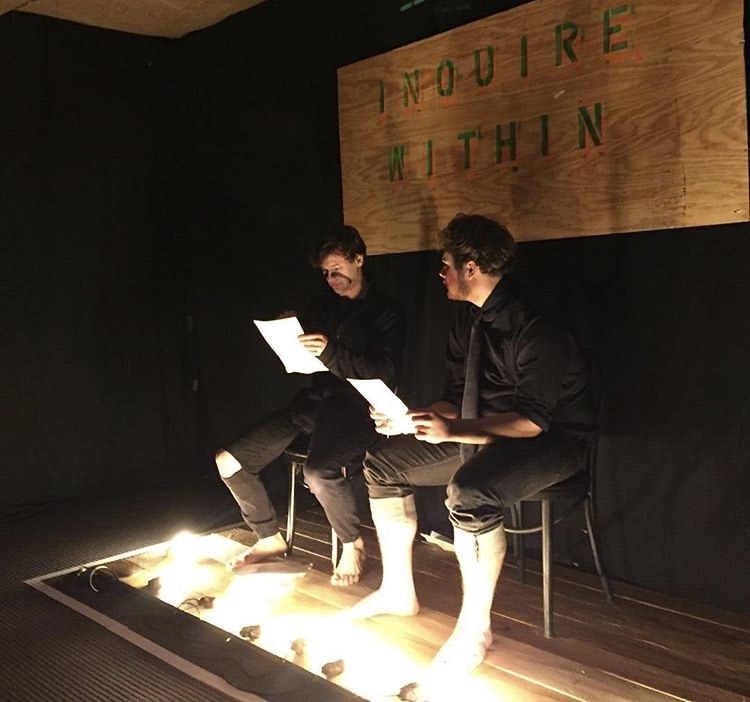 Inquire Within wasn’t rehearsed or staged. In a dark room with a string of lights, a pair of actors dressed in black asked and answered questions. The catch? The person asking questions could ask any question they wanted, but could only ask questions. The person answering could only answer as themselves, not as any character, and they couldn’t refuse the question, no matter how personal. The askers had a sheet of questions, from the simple “What’s your favorite food?” to “What would you change about yourself?” The show was ongoing throughout each night of the festival, with the actors rotating every half hour. “There was something strangely human and profound about it,” says Edward Lindem ’19 after watching the piece.