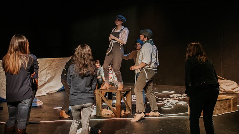 When viewers of Two Points off the Weather Bow (pictured above) walked into the black box theater, they were surprised to find no seats; boxes, crates, ropes and other items formed the deck of a ship. Audience members stood and wandered around as the actors told the story of a whaling voyage. The cast treated the audience as a part of the “crew,” asking them to coil ropes, swab the deck, participate in a trial, sing sea shanties and make bids for an auction. The climax of the story was a whale hunt, where the audience members pretended to be on life boats, using their arms to mimic rowing and throwing harpoons at a whale in the water. This immersive piece was written and directed by theater major Jonathan Wacker ’19 as part of his senior seminar project. “Two Points was designed to lean into what I believe the strengths of theater are: action and community,” he said.