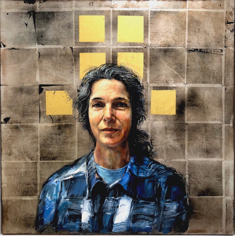 Though creating paintings, Herman’s inspiration of iconography demands delving into the metaphysical. In the Orthodox Church, venerated icons of saints serve a liturgical purpose. Beyond channeling this tradition’s style of gold and silver leaf, Herman employs the meticulous care that icon writers pour into their creation, and lifts a veil between the subject—ordinary saints—and the viewer.