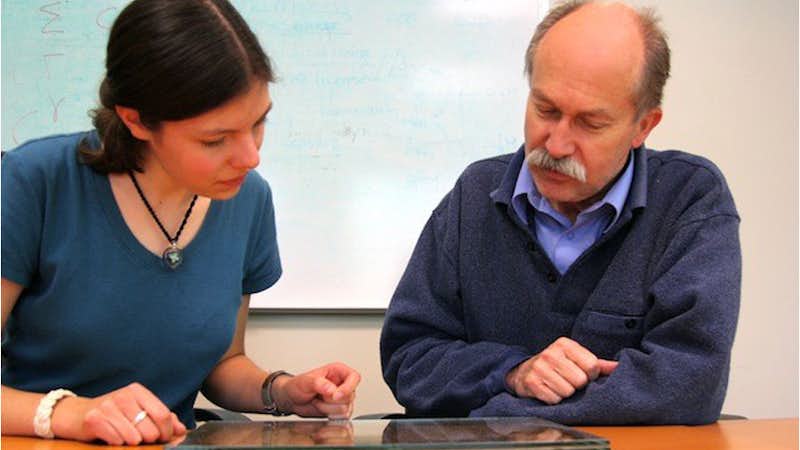 Photo: Dr. Bird shows Sarah Seibert '14 the 1800-year-old papyrus now on loan at Gordon College. While the piece is on campus, Bird is working with his students on producing an edition of the piece for publication.