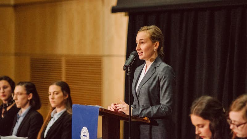 But, the debate is not based on personal opinion. It’s an exercise in oratory, so JAF scholars are randomly assigned to teams—regardless of their personal stance. In the end, the audience chooses the winning team based on who made the most compelling case.