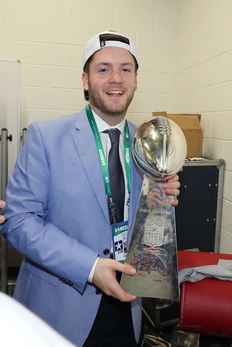 Brown with the Vince Lombardi Trophy following the Patriots 13-3 victory over the Rams in Super Bowl LIII. Courtesy of the New England Patriots/David Silverman.[/caption]