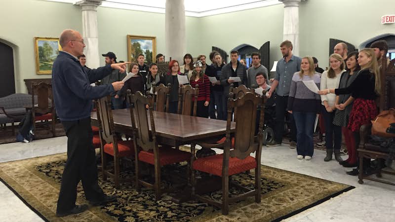 Ian Drummond, who teaches history and Latin at Gordon, started this annual pre-Christmas tradition four years ago. "I was originally inspired to craft an ‘active’ component of Latin, since it's a ‘dead’ language," Drummond says, “and music is one point of access. Plus, it’s a way to make our Latin-learning community a bit more visible on campus and spread Christmas cheer." Graeme Bird (who teaches Classical Literature) conducted the singers this year from across the 17th-century oak refectory table that anchors the lobby.