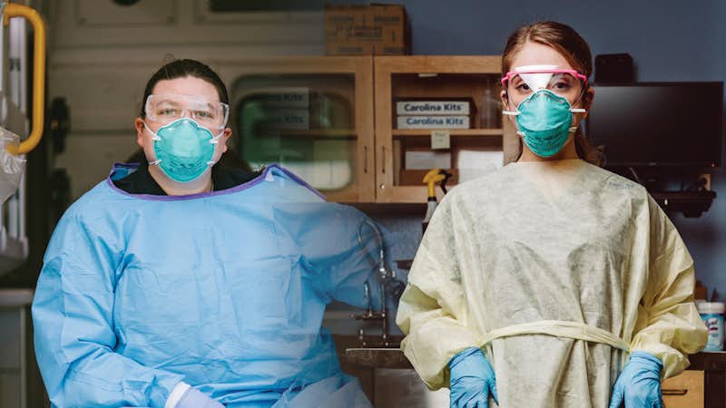 Incoming 911 calls and the subsequent cry of sirens aren’t a standard study interruption for most college students. But for Samantha Wallis ’20, pictured left, they’ve been part of everyday life since she became an emergency medical technician (EMT) during her first year at Gordon. Wallis says, “I wanted to be able to help people and make a difference in the world,” and she didn’t want to wait until graduation to do so. But when COVID-19 hit, making a difference in the world took on a new layer of significance for Wallis—and a new layer of personal protective equipment (PPE).