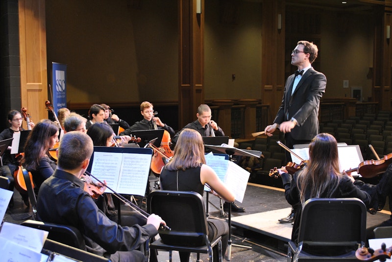 Whether he’s directing a professional orchestra in Beethoven or teenagers in “Hot Cross Buns,” Langille says conducting requires a human element. In moments of vulnerability—when someone misses a cue, sweats before a solo or cracks on a high note—he says “little miracles” occur when he has the grace to maintain a humble attitude, give an encouraging glance and convey his respect. “If we can validate students’ voices and say, ‘You have a seat at this table, and I can learn with you,’” says Langille, “then when we’re onto something.”