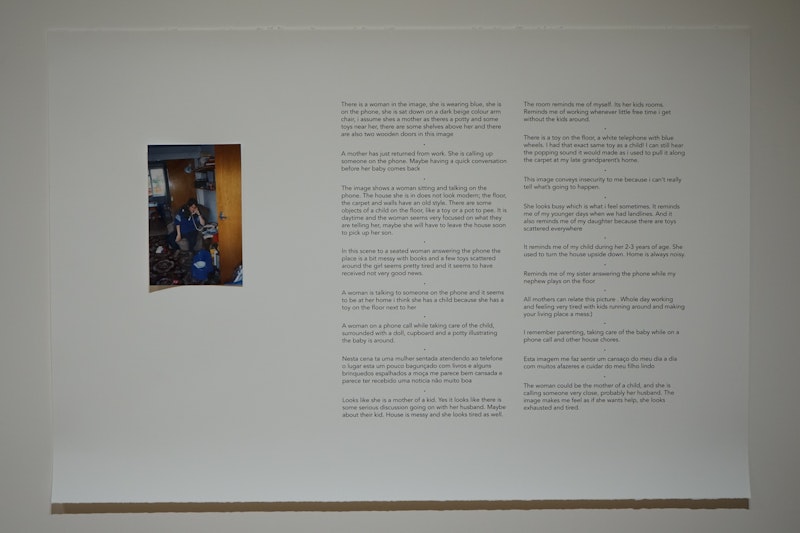 For his photography piece All the Risks of Failed Comprehension, Deddo took inspiration from Amazon Mechanical Turk, which is used in the process of making AI tools to ask real human workers to objectively identify the things in a photograph. The workers' annotations are then used for machine learning. Deddo used MTurk to ask workers to do the opposite—to subjectively infer what they thought was happening in photos of his family. Then he asked them to describe what the photo reminded them of in their own life.