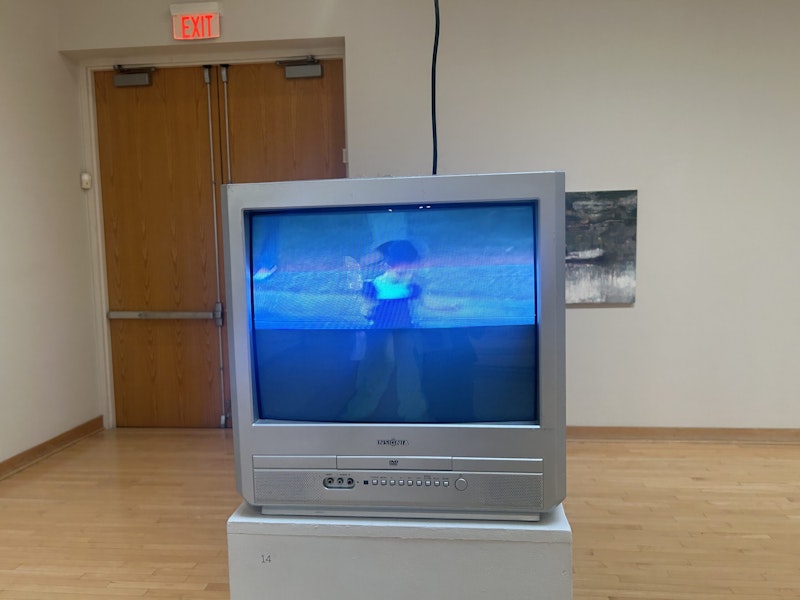 A multitalented artist, Deddo’s exhibition includes pieces in a wide variety of mediums: paintings and photos on the gallery walls, videos on vintage TVs, embroidered tapestries hanging from the ceiling— and even AI. One video is of Deddo's younger sister dancing, but he slowed the speed down, and the girl was erased and replaced in each frame with images from an AI image generator. The video piece, Little Girl Dancing, displayed on a 1999 Insignia 13” TV, has almost 2,000 unique AI figures.